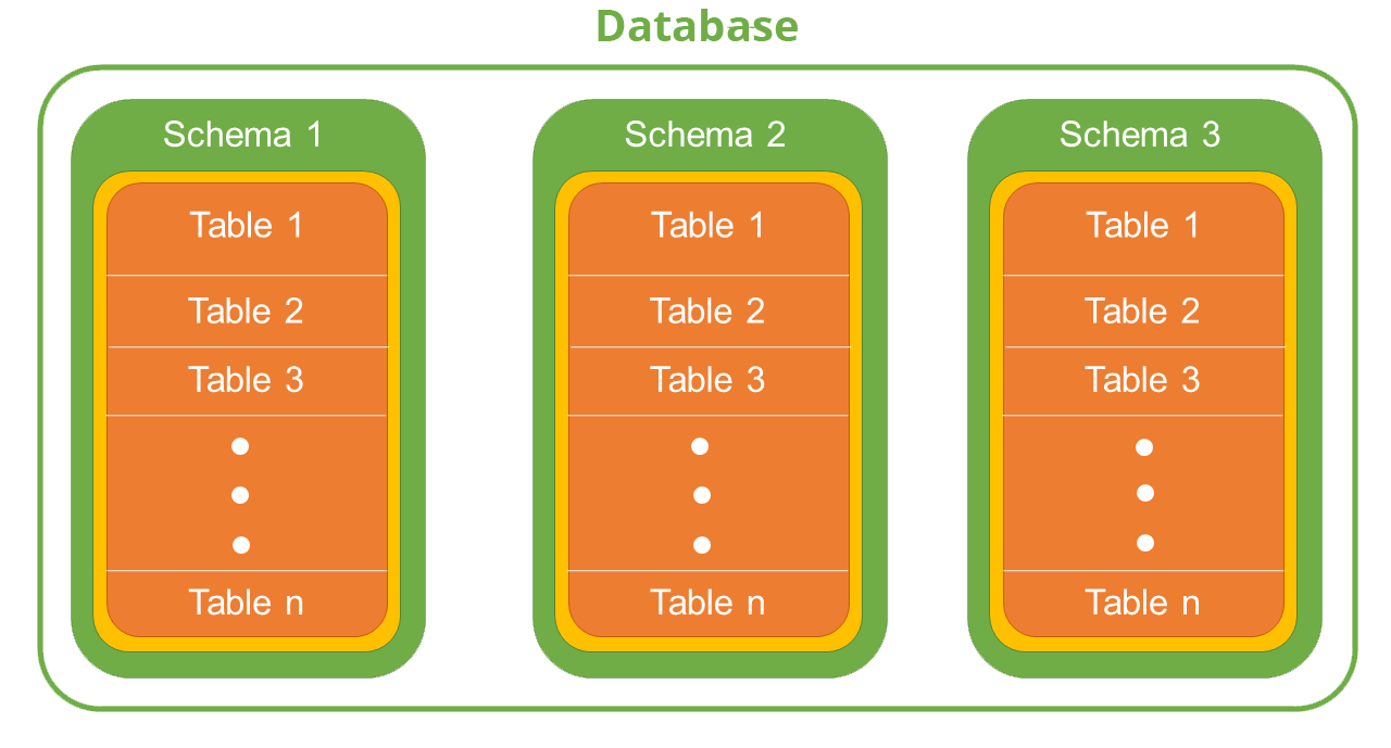 Una base de datos contiene uno o más esquemas, los cuales a su vez contienen tablas y otros objetos.